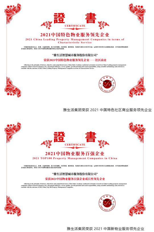在此次百强研究测评中,雅生活首次以“智慧城市服务商”的身份荣获“2021中国智慧城市服务领先企业”和“2021中国特色服务领先企业——社区商业”,这也说明雅生活在智慧城市服务、创新服务生态构建等领域已获得广泛认可。